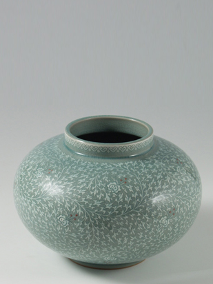 방철주 선생님 순청자巳形붓받침대 (左)靑華象嵌菊花文八角花甁(右)靑華象嵌菊牧丹文鶴首甁 (左)靑華象嵌雲鶴文杯(中)靑華象嵌雲鶴文酒甁(右)靑華象嵌雲鶴文梅甁 靑磁鳳凰兩耳花甁 靑磁魚兩耳花甁 靑磁辰砂剝地唐草文壺 靑磁鷄龍杯 磁逆象嵌童子文注子